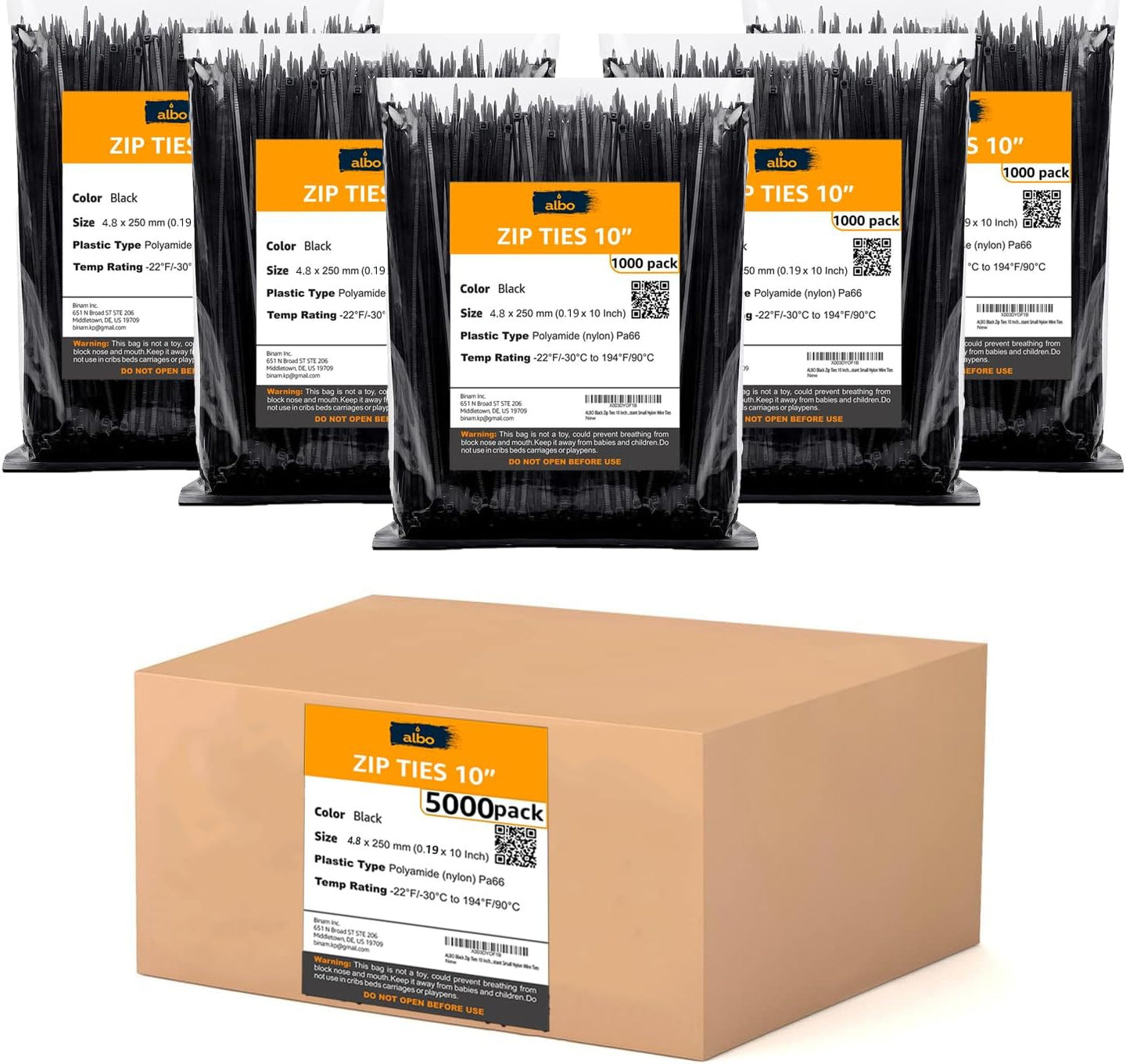 ALBO Black Zip Ties 10 Inch, Nylon Wire Ties for Indoor and Outdoor, Pack 5000 pcs