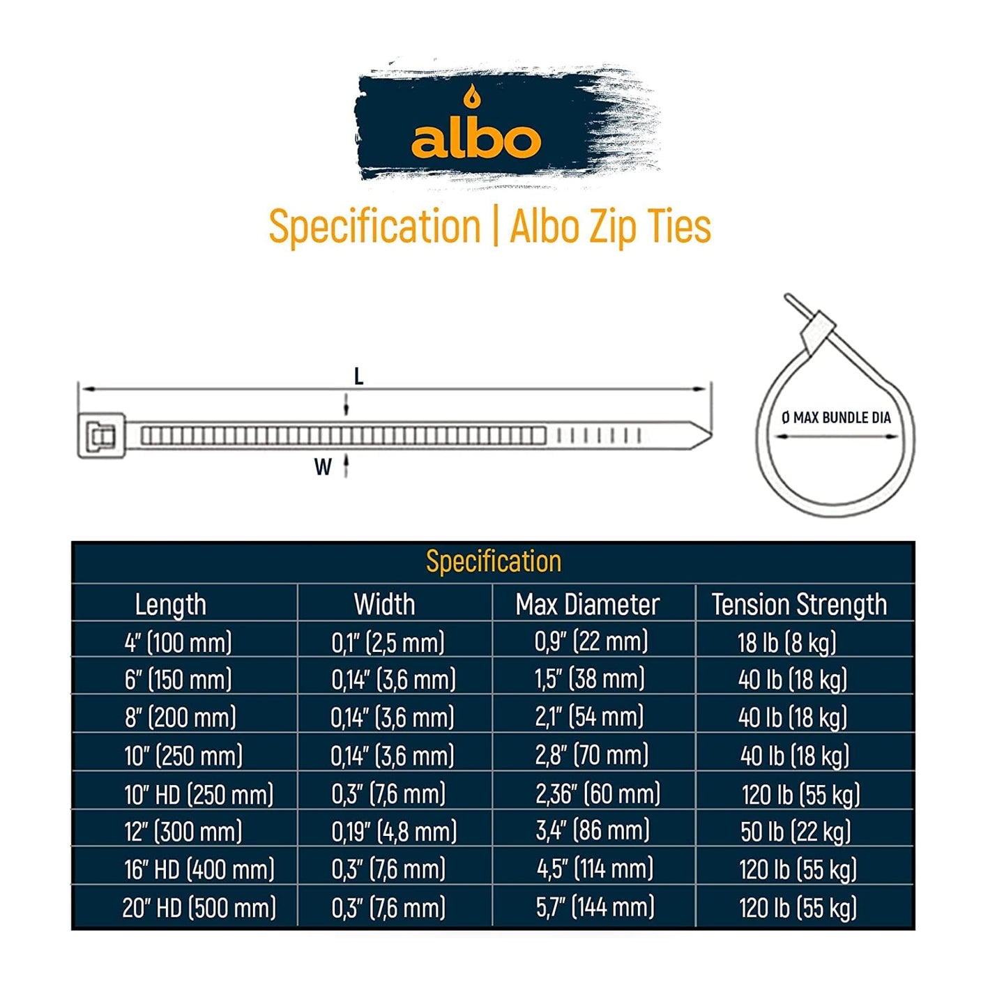 - CABLE TIES 4 INCH SPECIFICATION: 1000 Psc, Color: Black, Length: 4 inch/100 mm, Width: 0.9 inch/22 mm. Max bundle diameter: 0.9 inch/22 mm.