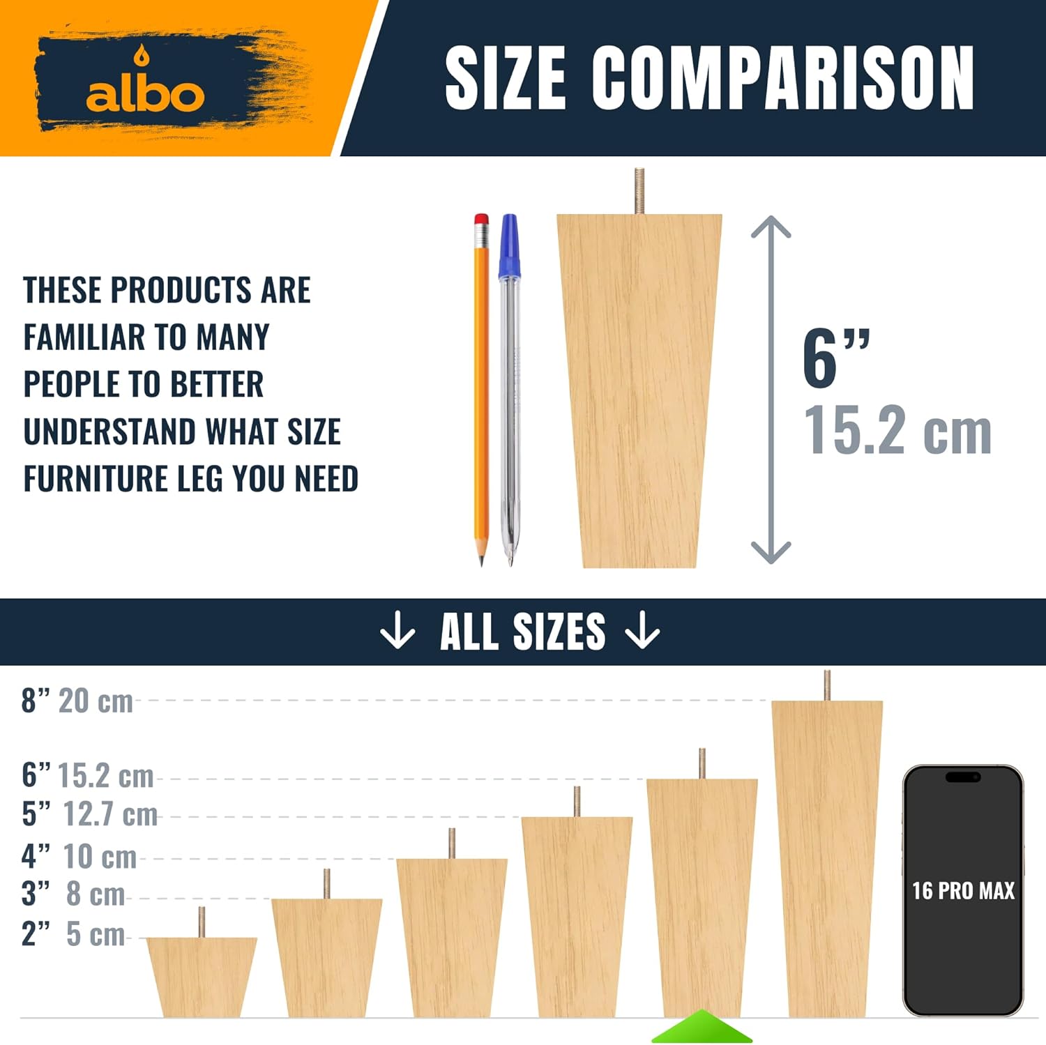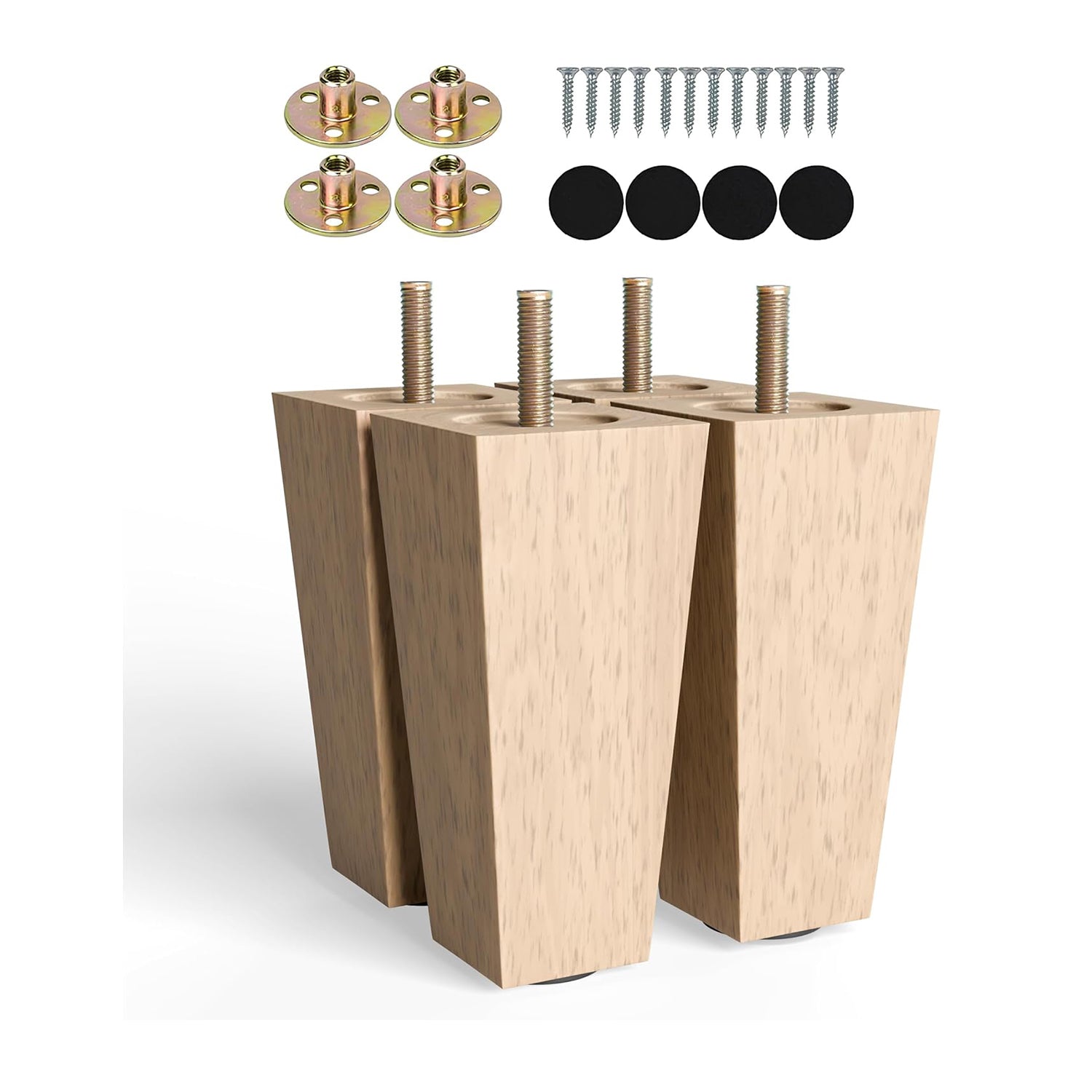 - 【Mid-Century Style】Wood couch legs 6 inch heavy duty, coated with clear varnish are classic for most furniture feet styles like armchairs, nightstands, and drawers. Ideal for wooden legs for furniture set of 4 in DIY projects. Also suitable as sofa legs 6 inch and dresser legs set of 4.